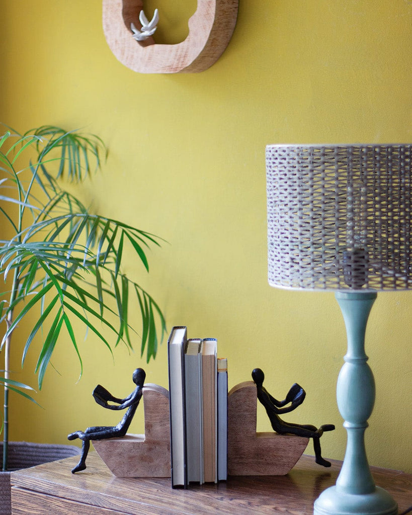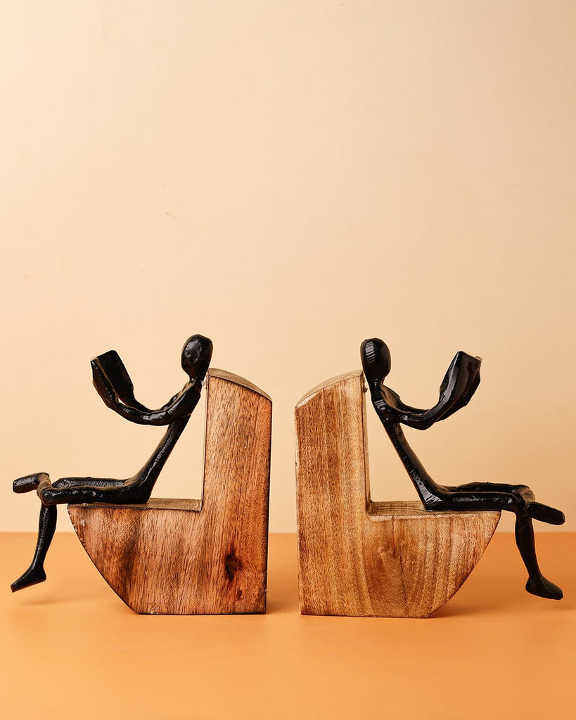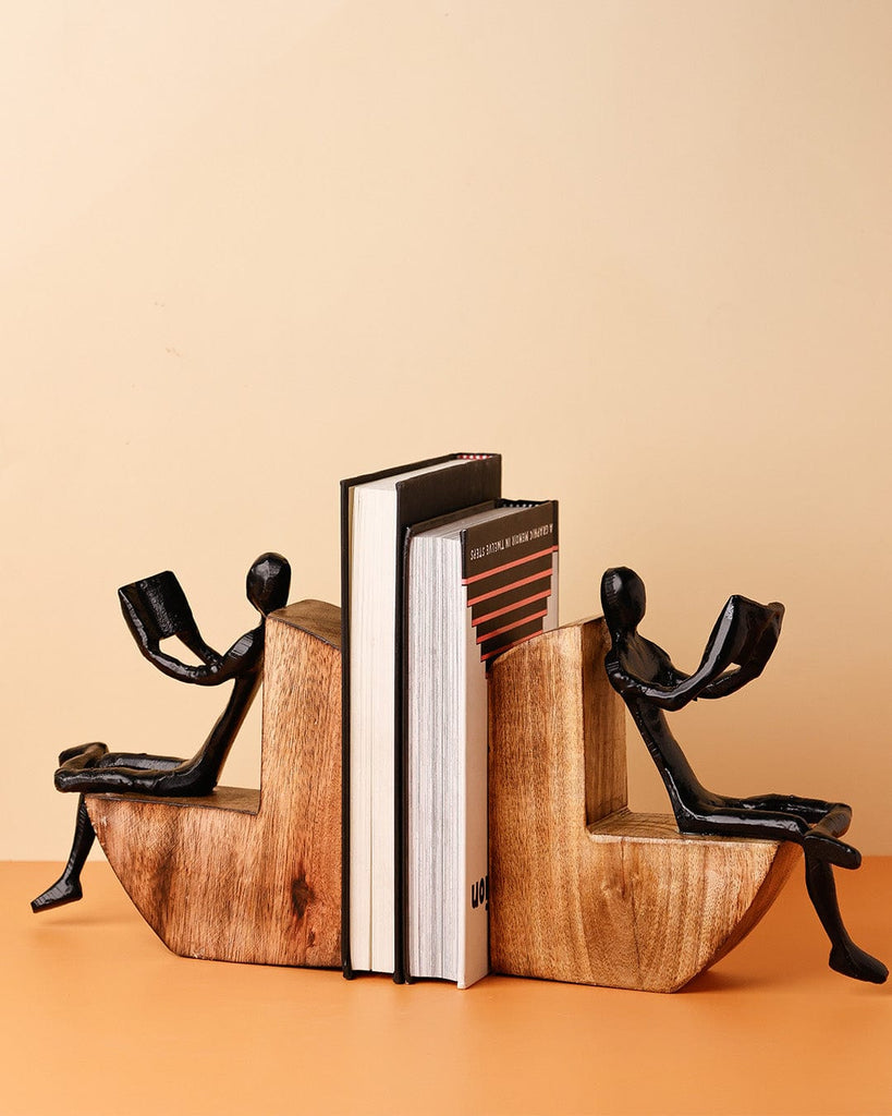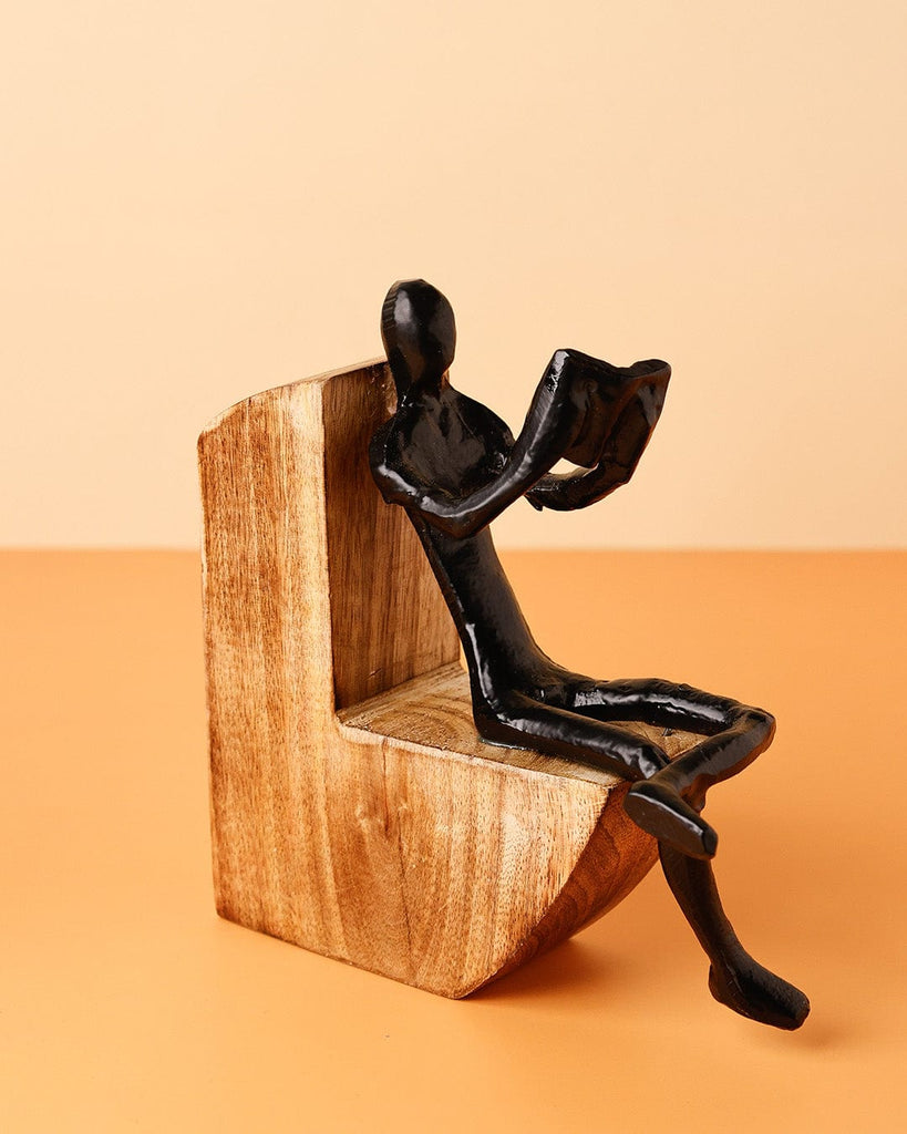 Celebrate the love of reading with The Reader Wooden Bookends, a beautifully handcrafted pair that blends art and function. Each bookend features a sleek metal figurine engrossed in a book, seated gracefully atop a solid wooden block. The warm tones of natural wood contrast elegantly with the matte black finish of the figures, creating a timeless piece for any book lover’s collection.