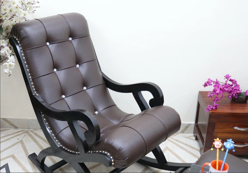 A sleek rocking chair with a smooth wooden frame and plush black leather cushion, combining comfort with timeless elegance.