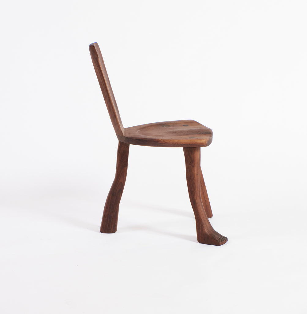 A quirky, artistic small chair with a minimalist design, featuring one leg sculpted as a realistic human leg and foot, blending function with playful creativity.