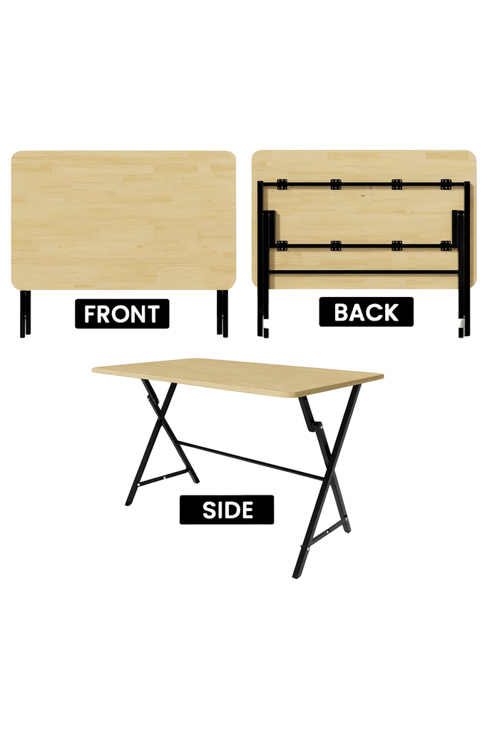 Compact folding table with a light wood top and sturdy black metal legs, offering durability, easy storage, and a sleek modern look.