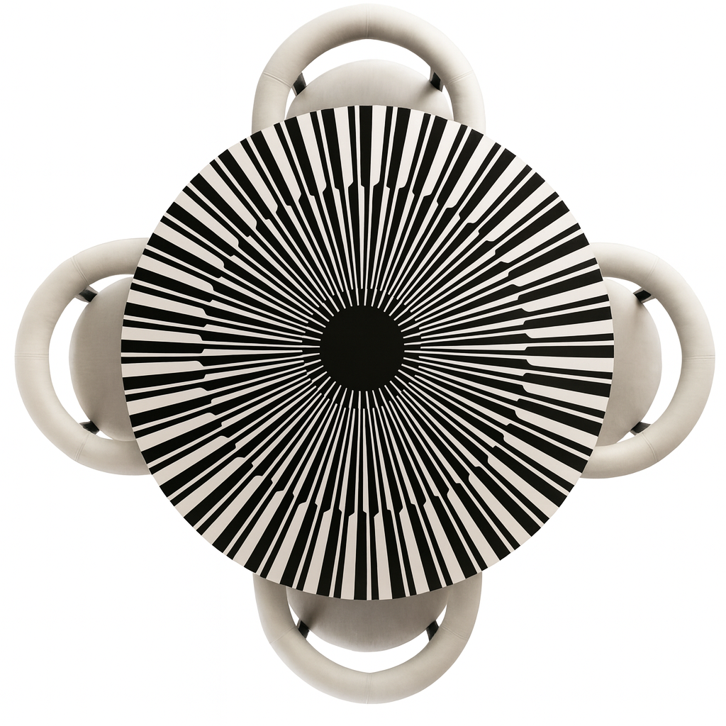 Striking round dining table with a bold black-and-white radial pattern, paired with four plush circular-back chairs for a modern artistic statement.