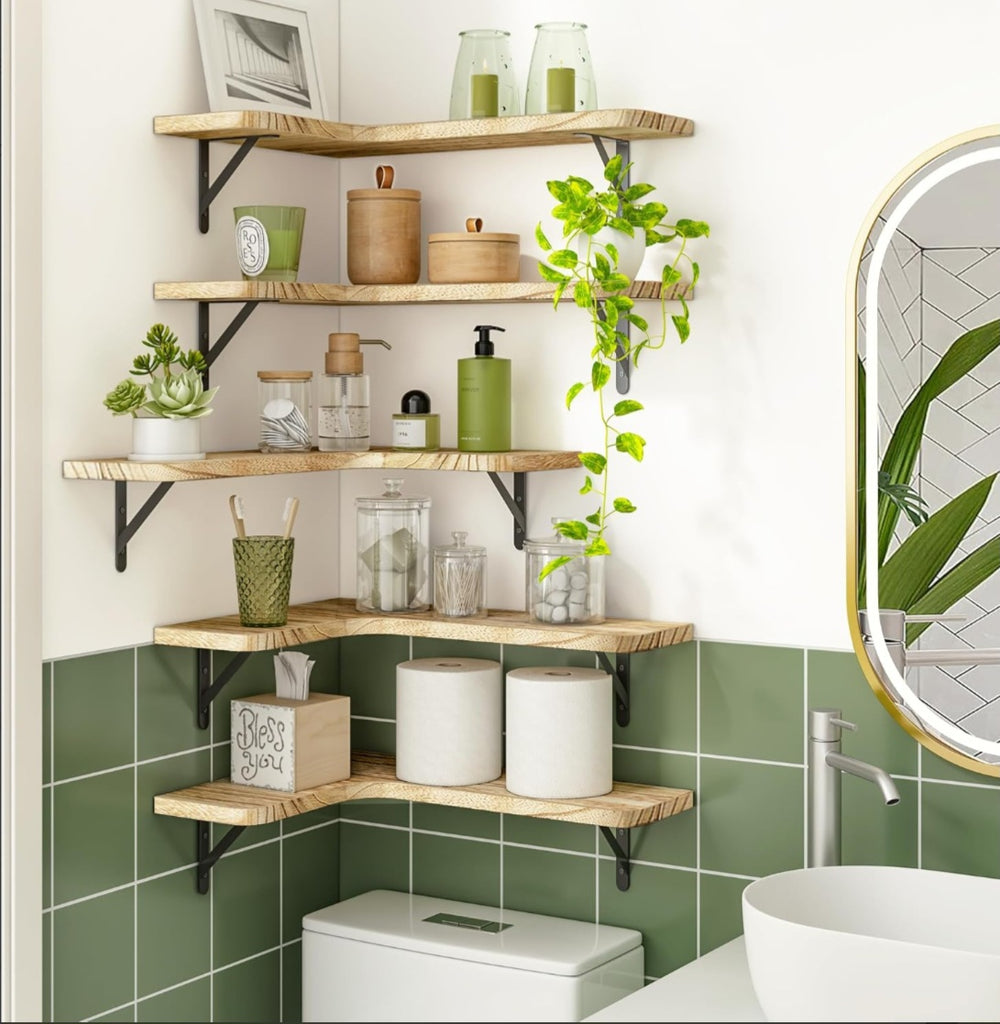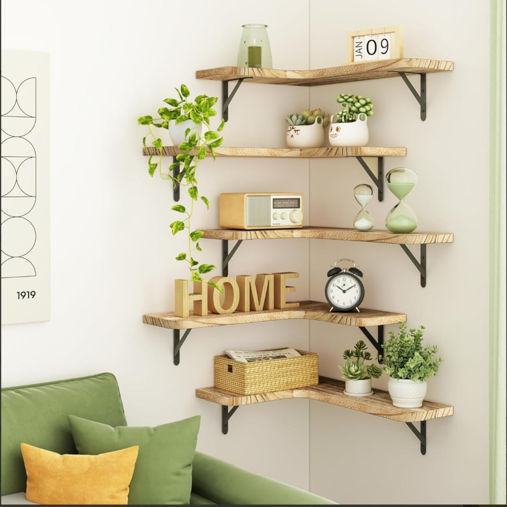 Rustic wooden corner wall shelves in a set of four, featuring a vintage finish and sturdy design. Perfect for maximizing corner space while displaying books, plants, or decorative items in a stylish way.