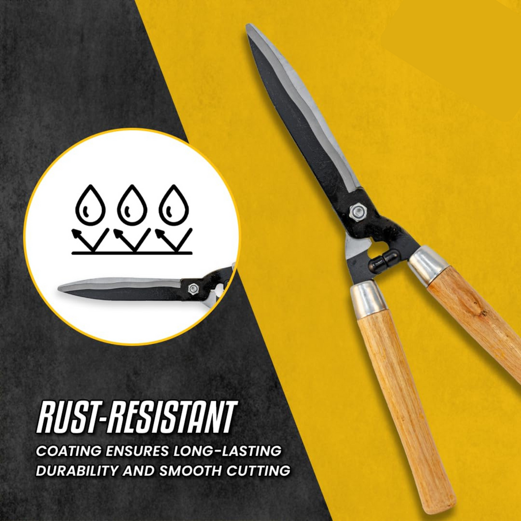 Wooden garden scissors with sturdy stainless steel blades and smooth wooden handles, designed for comfortable grip and garden cutting tasks.
