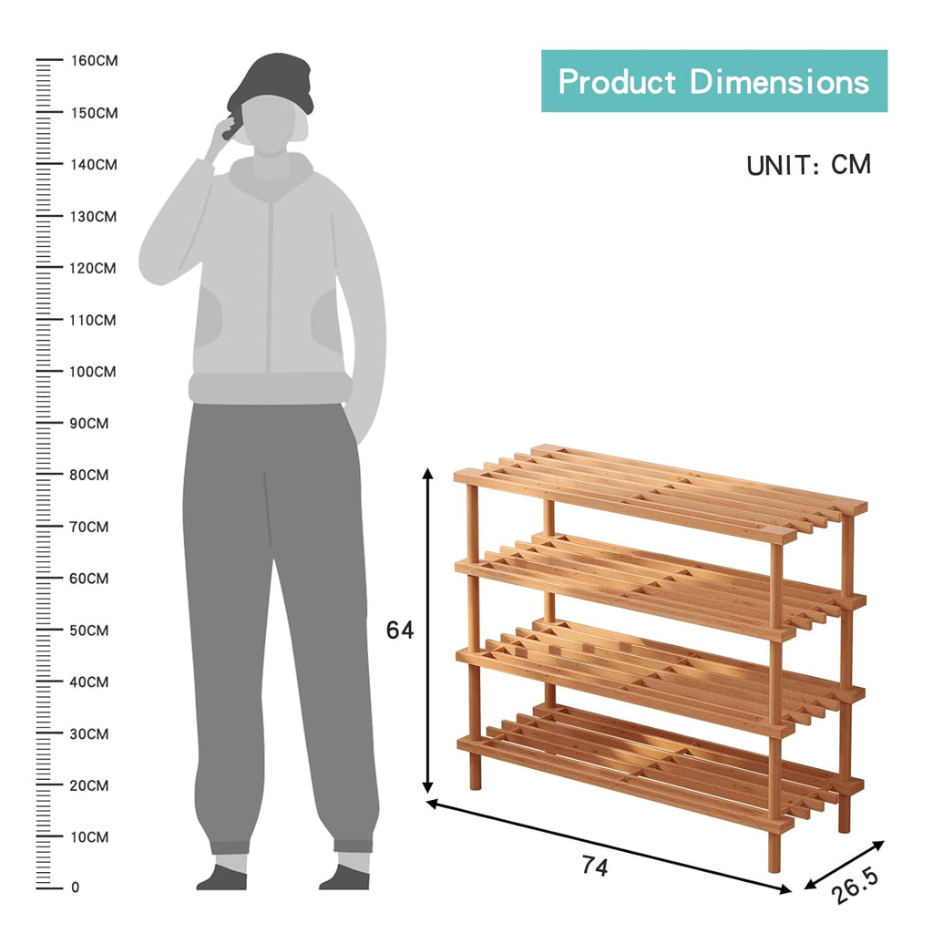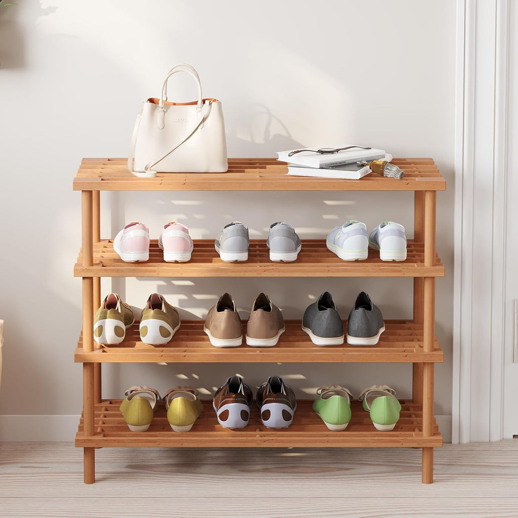 A compact wooden shoe rack with four open shelves, offering organized storage for multiple pairs while keeping entryways neat and tidy.