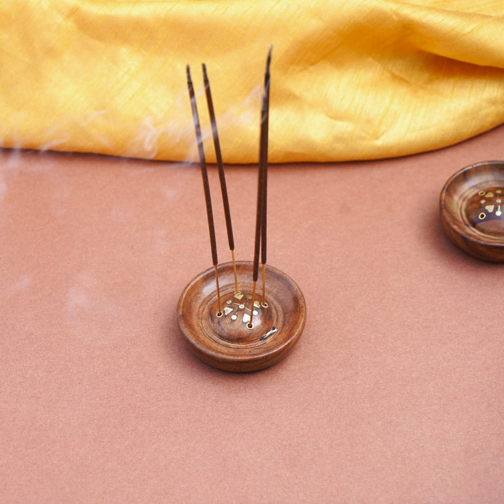 A compact round incense stand made of natural wood with brass inlay, designed to hold multiple sticks securely while keeping the space neat and fragrant.
