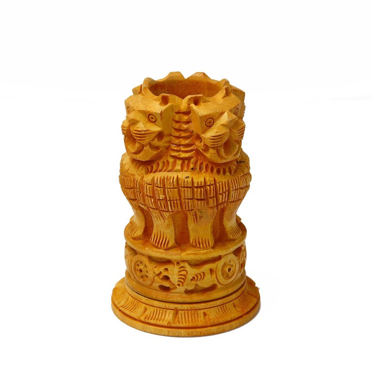 Emblem Pen Holder – A finely carved wooden pen stand inspired by the Ashoka Pillar, featuring detailed lion motifs and intricate traditional patterns. This elegant piece adds a touch of heritage to any desk while keeping pens and stationery neatly organized. Perfect as both a utility item and a decorative showpiece.