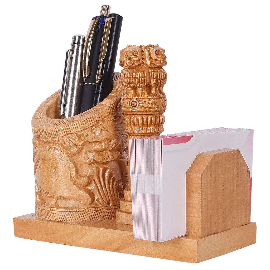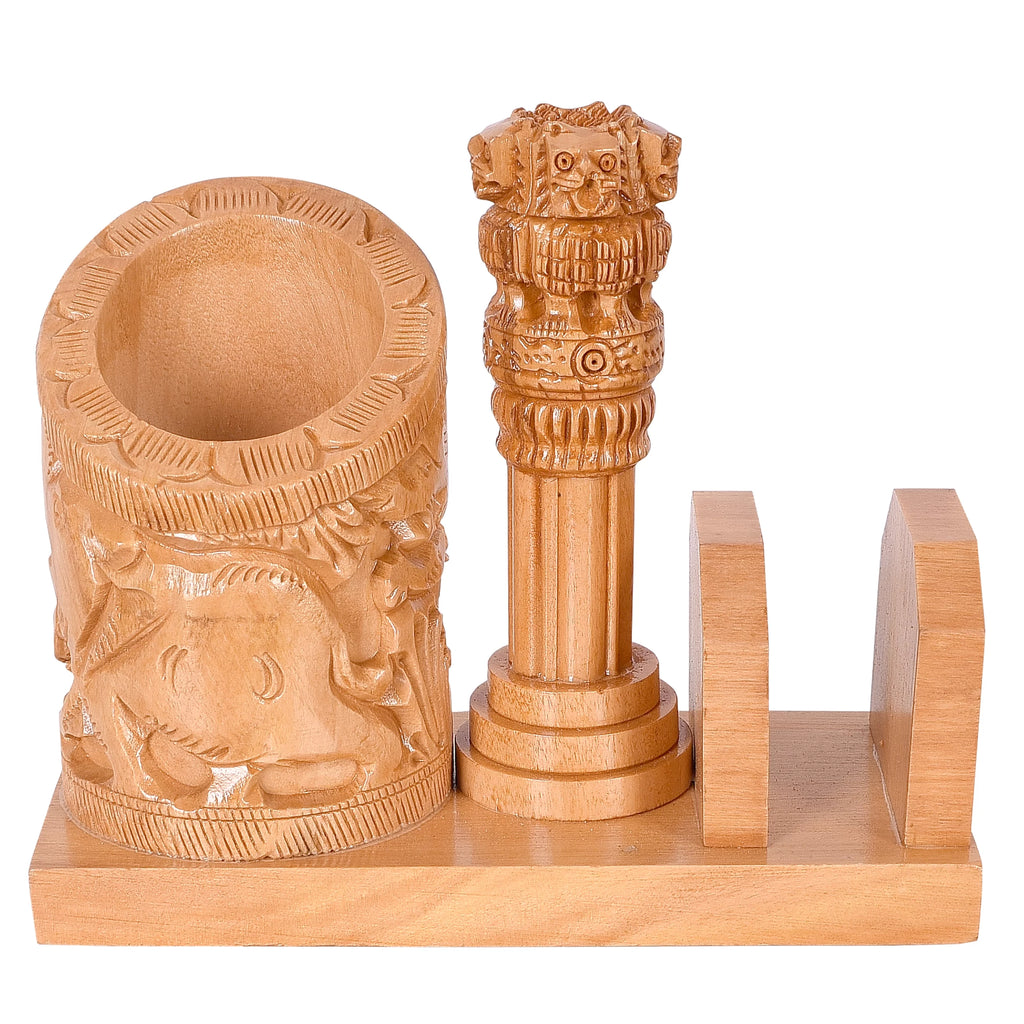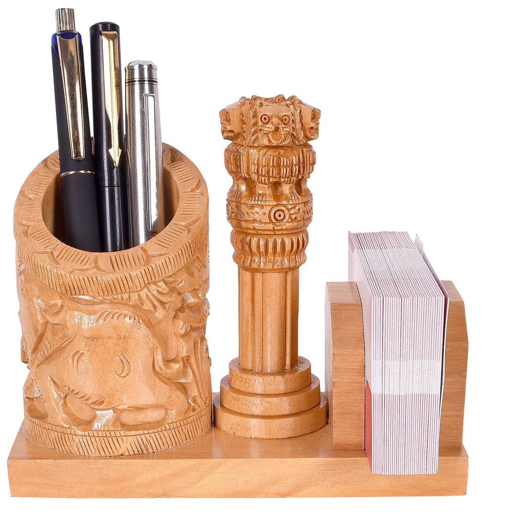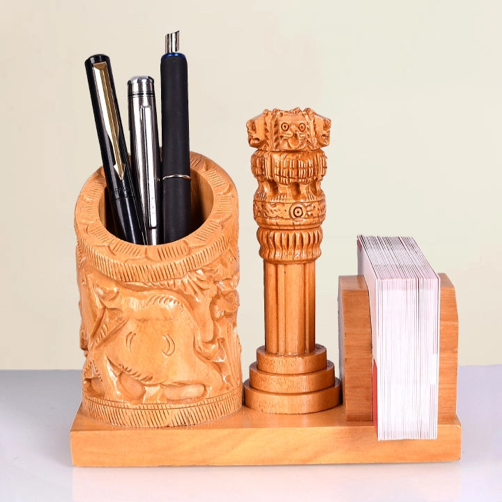 Emblem multifunctional Pen Holder – A finely carved wooden pen stand inspired by the Ashoka Pillar, featuring detailed lion motifs and intricate traditional patterns. This elegant piece adds a touch of heritage to any desk while keeping pens and stationery neatly organized. Perfect as both a utility item and a decorative showpiece.