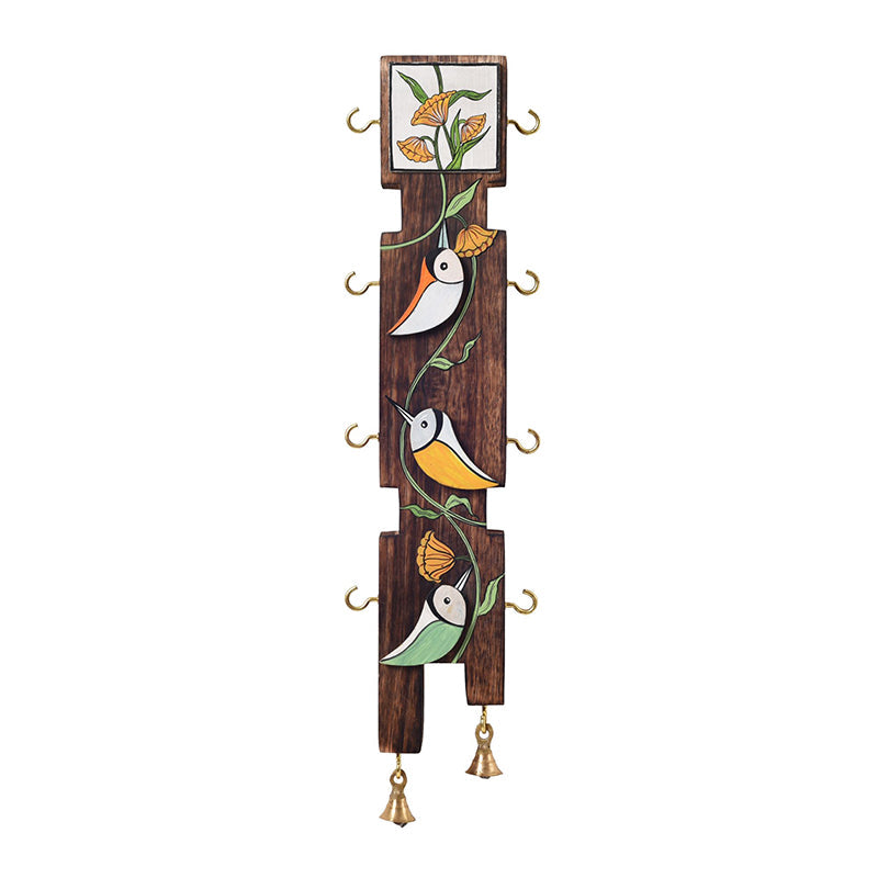 A beautifully designed wooden key holder featuring vibrant hand-painted birds and floral motifs climbing along a vine. Equipped with multiple sturdy hooks and two decorative hanging bells at the bottom, it combines utility with traditional artistry. Perfect for organizing keys while adding a charming, nature-inspired touch to your home décor.