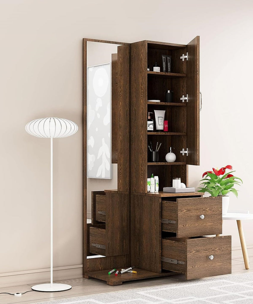 A sleek, modern dressing table featuring a spacious tabletop, elegant mirror, and multiple drawers with smart compartments for organized storage, combining beauty with functionality.