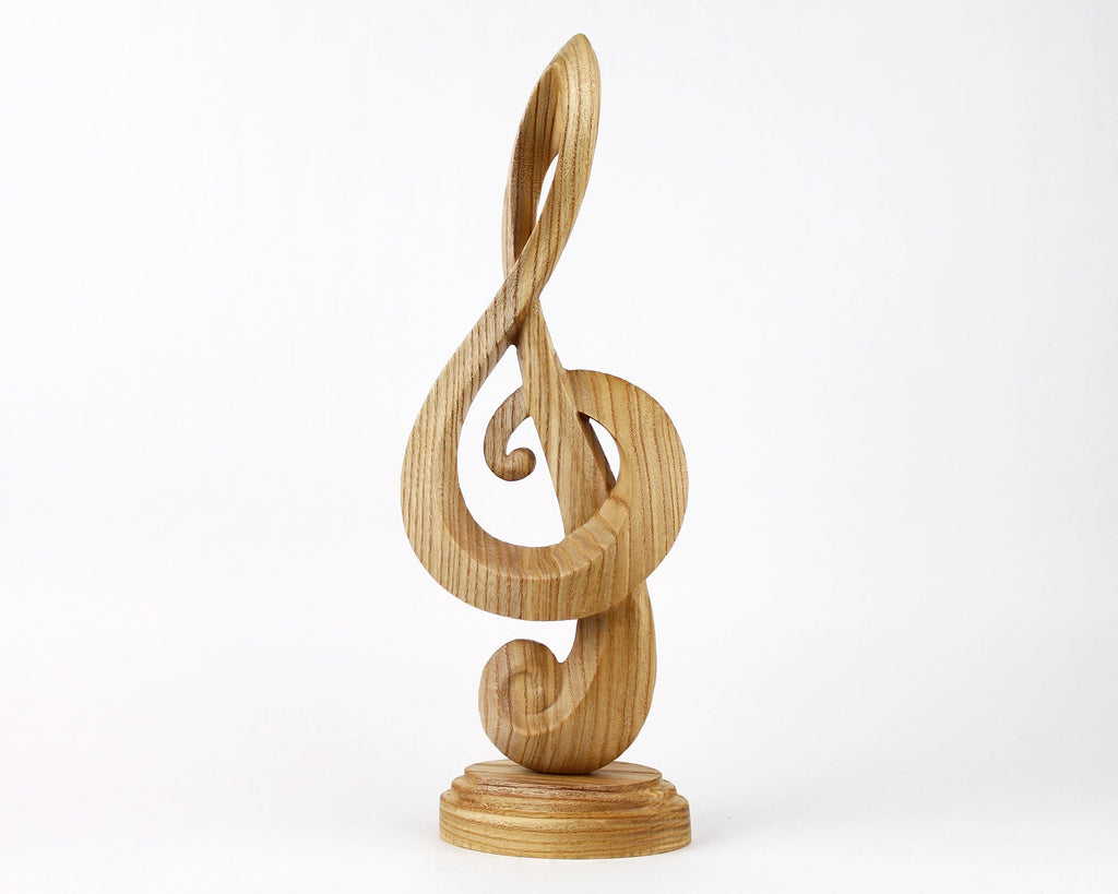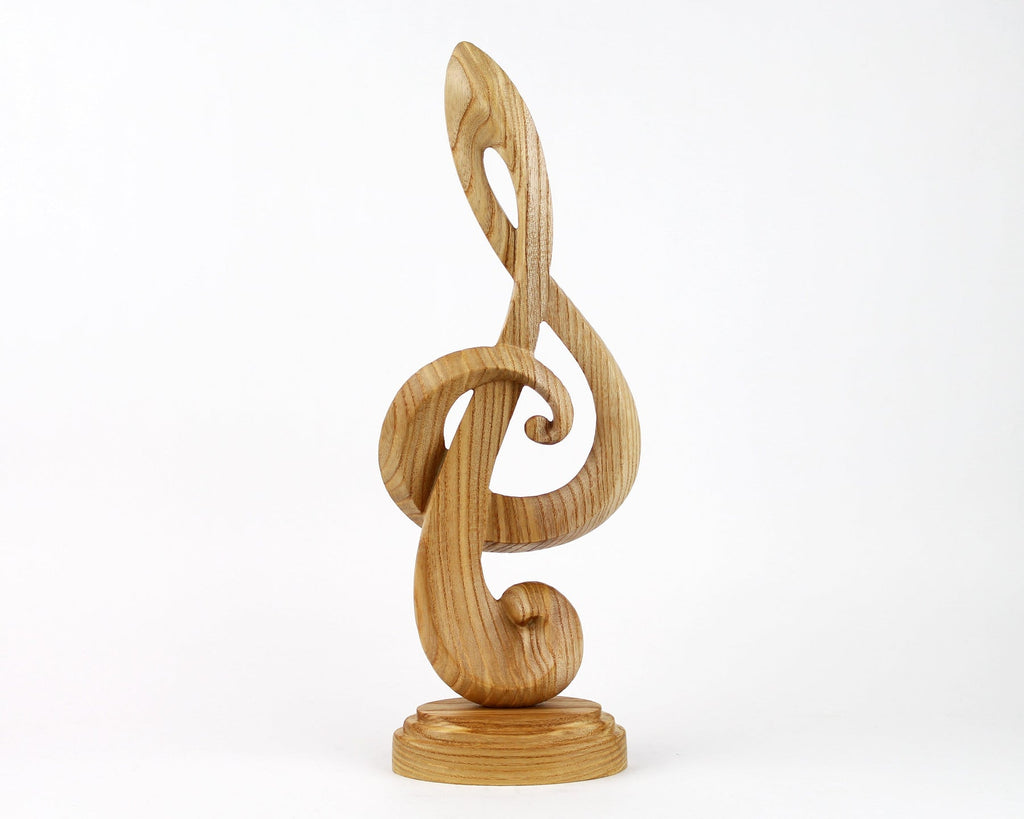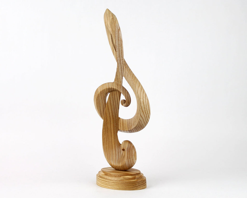 A finely handcrafted wooden sculpture shaped like a treble clef, symbolizing the beauty of music. With smooth curves and a polished finish, it stands elegantly on a sturdy base, making it a perfect decorative piece for music lovers. Ideal for display in living rooms, studios, or offices, it adds a touch of artistry and harmony to any space.