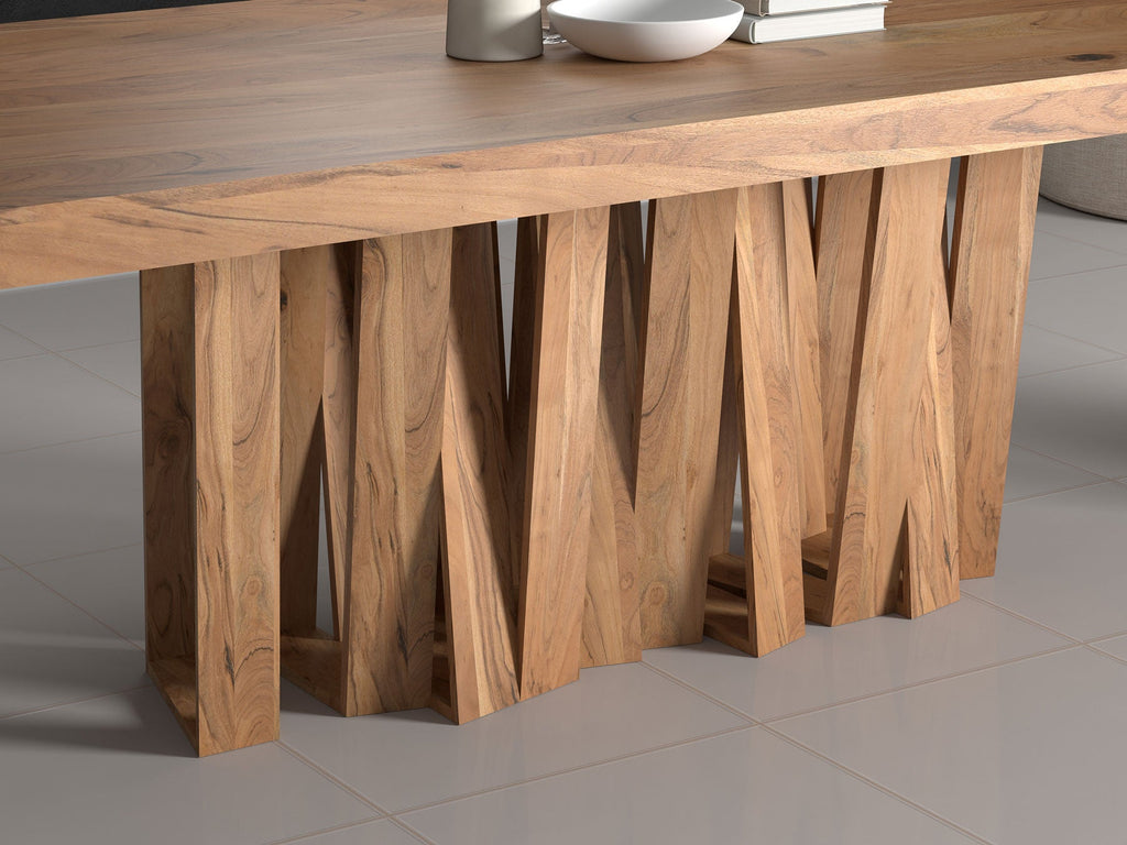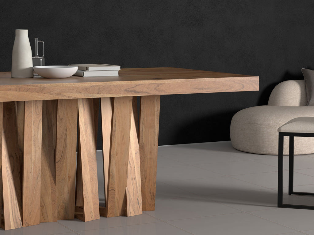 A contemporary solid wood dining table with a bold sculptural base and a sleek rectangular top, blending natural warmth with modern elegance.