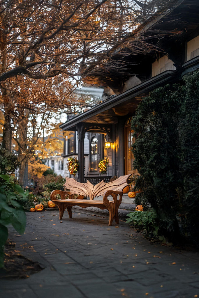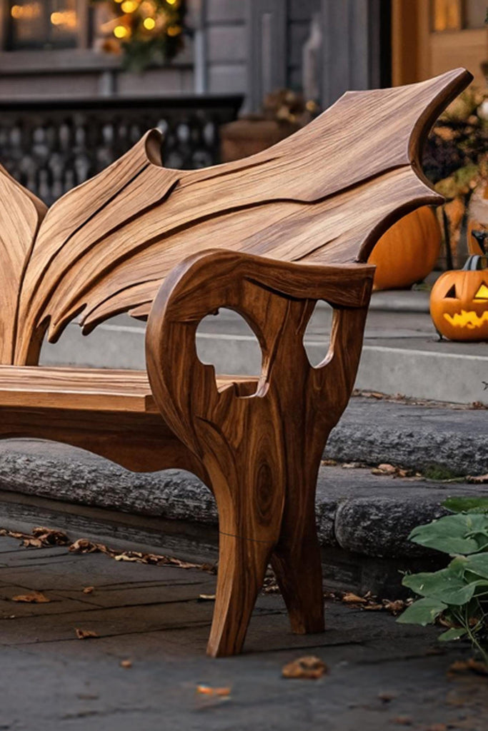 A stunning wooden bench with a sculptural firebird-inspired design, blending artistic elegance with functional outdoor seating.