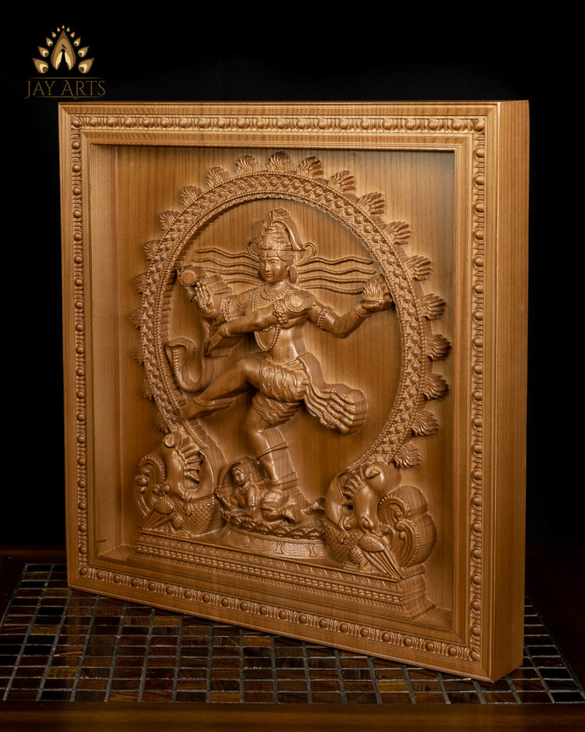 Handcrafted wooden wall panel featuring Lord Nataraja. Intricately carved with fine detailing and set in an ornate frame, perfect for home décor, pooja rooms, or gifting.
