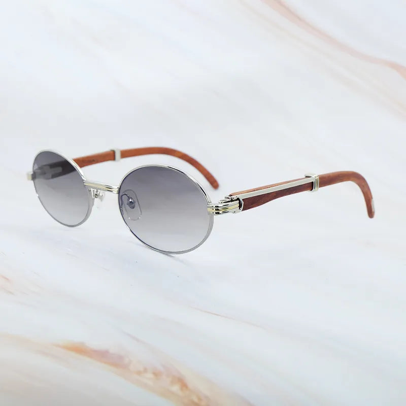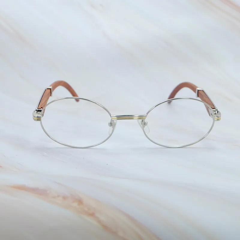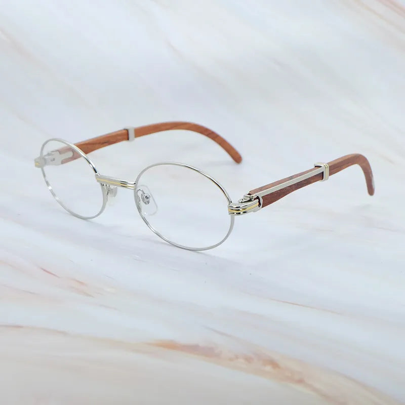 Minimalist and modern eyewear featuring a sleek oval lens design paired with natural wooden temples. Lightweight and eco-friendly, it offers a clean, contemporary look with a touch of earthy elegance.
