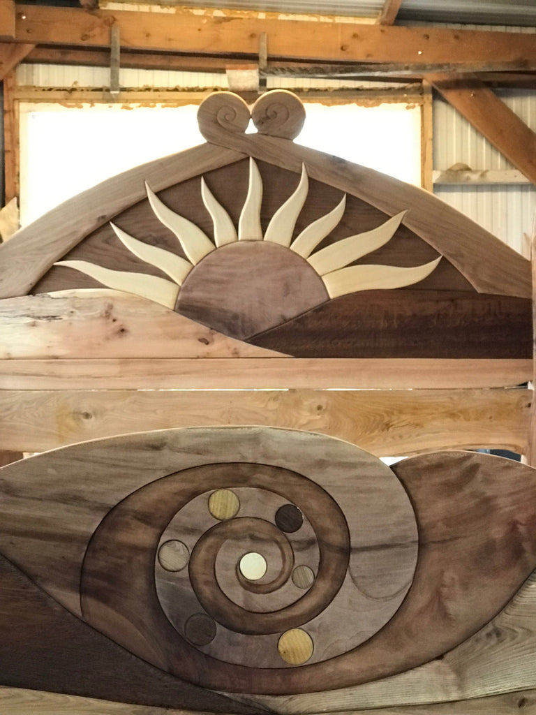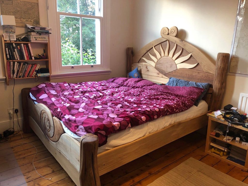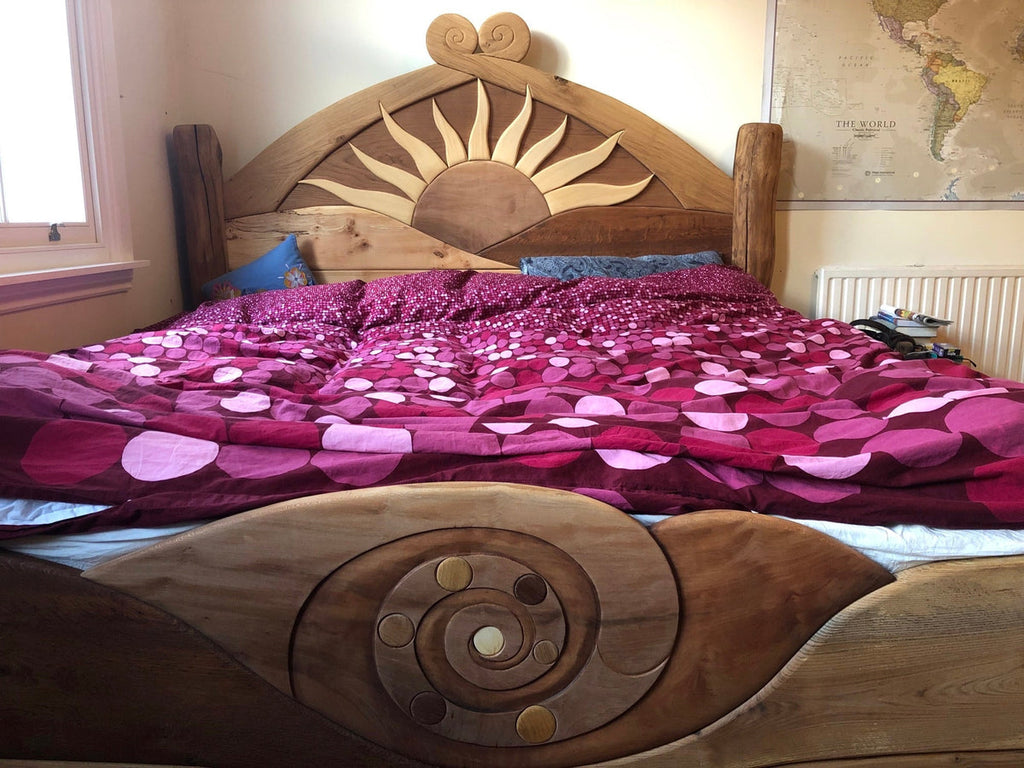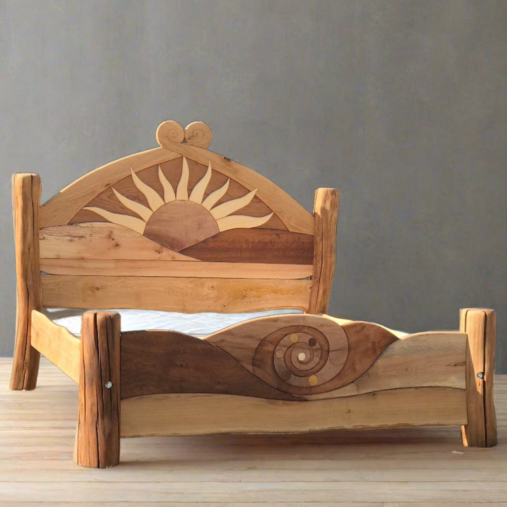 Stunning wooden bed with an artistic sun design, symbolizing warmth and energy. Crafted with precision, it adds a bold and radiant touch to any bedroom décor.