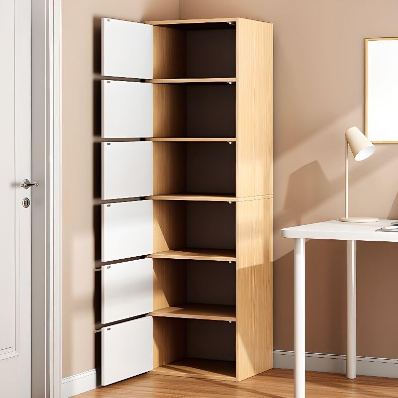 A tall wooden storage cabinet with six doors, offering a sleek and space-saving solution for organizing essentials in any room.