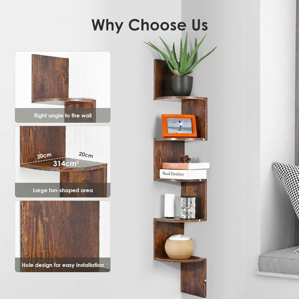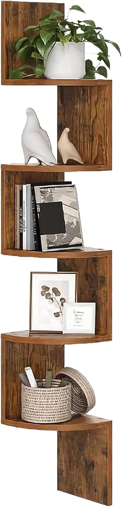 Modern corner wall shelf unit with five wooden shelves. Stylish and space-saving, perfect for displaying books, décor, plants, and collectibles in living rooms, bedrooms, or offices.
