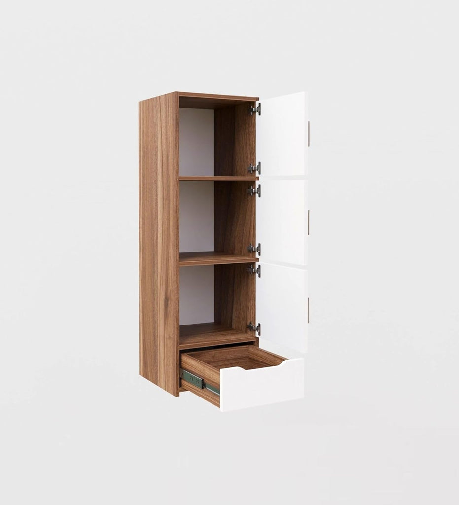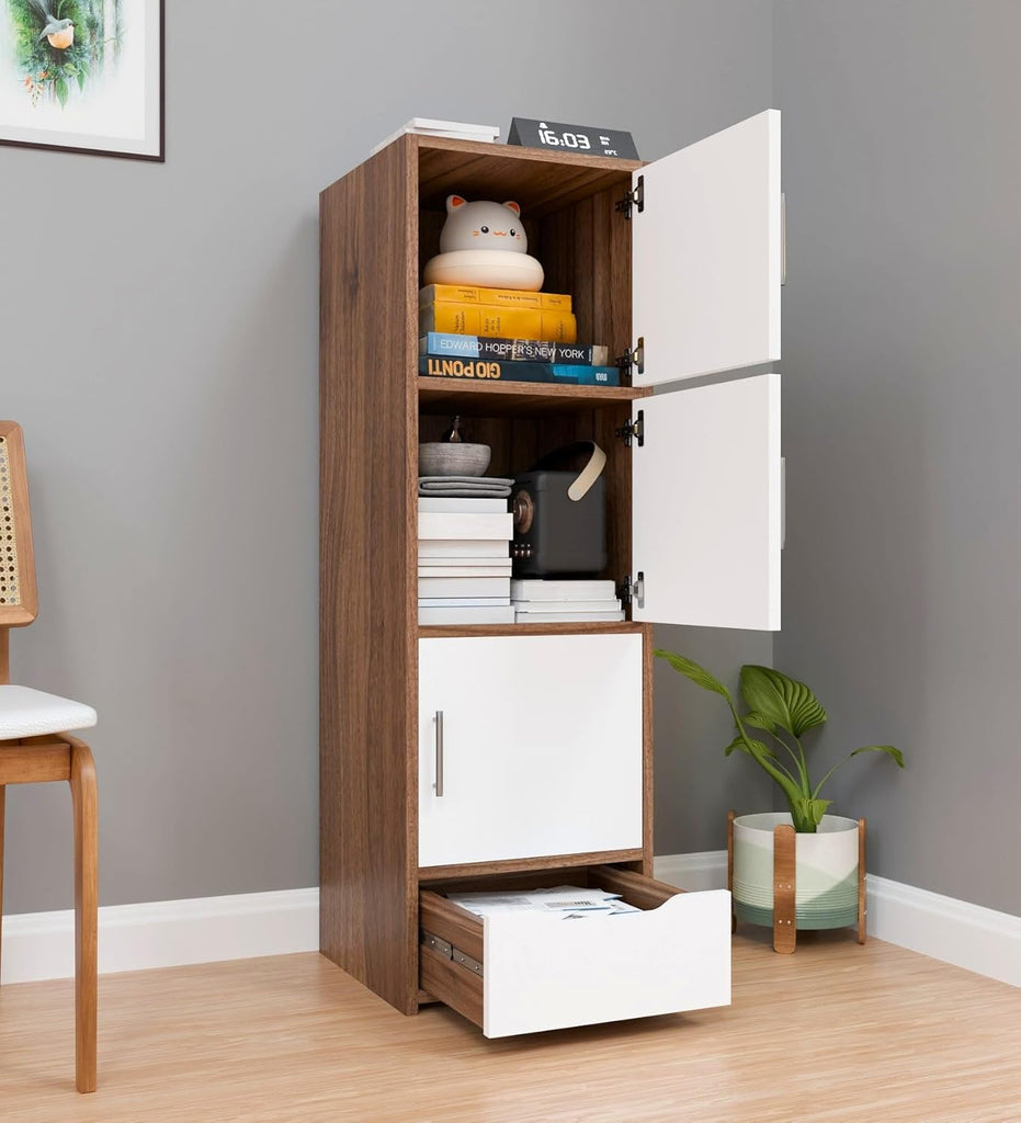 A tall wooden storage cabinet with four doors, offering a sleek and space-saving solution for organizing essentials in any room.